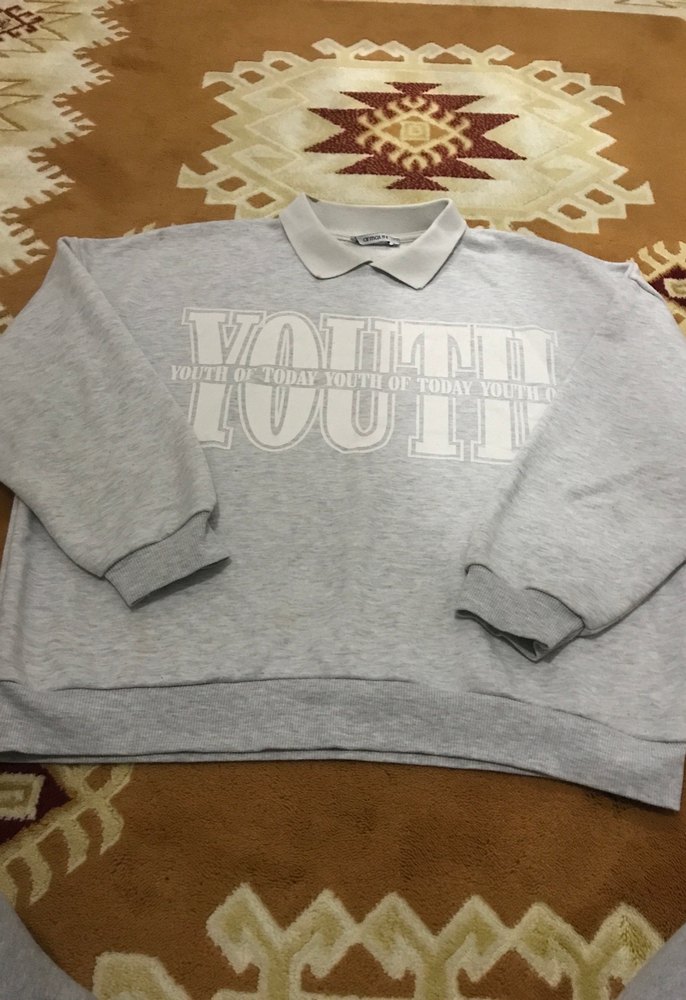 Bu kadın sweatshirtü, rahat kesim, uzun kollu ve bisiklet yakalıdır. Yumuşak, örme kumaştan yapılmış olup önünde "YOUTH" baskısı vardır. Gri renkte, günlük sokak stili için uygundur.