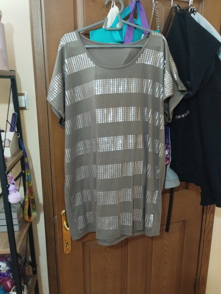 Kısa kollu, yuvarlak yakalı, gri baskılı desenli, salaş kesim kadın tişörtü. Rahat sentetik kumaştan, günlük sokak stili için ideal. ✨ 52/54