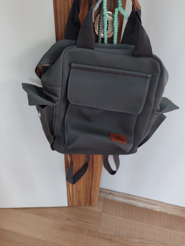 Gri renkte, baskılı desenli ve çok gözlü dayanıklı bebek çantasıdır.