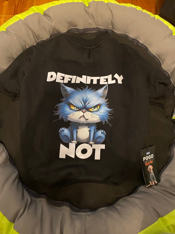 Koyu gri şişme kumaştan sokak stili kedi kıyafeti, baskılı sinirli kedi ve 'DEFINITELY NOT' yazılı.