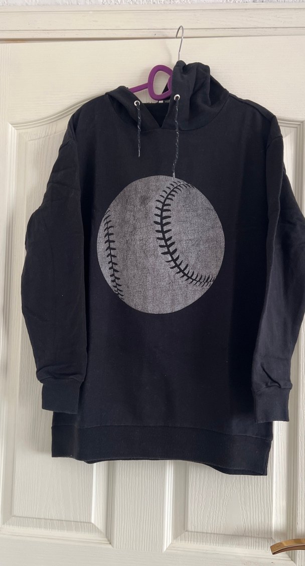Uzun kollu, bisiklet yaka siyah sweatshirt, büyük gri beyzbol baskısı ve zincir detaylıdır. Rahat kesim ve midi boyda, yumuşak ve sıcak kumaştan üretilmiştir. ⚾