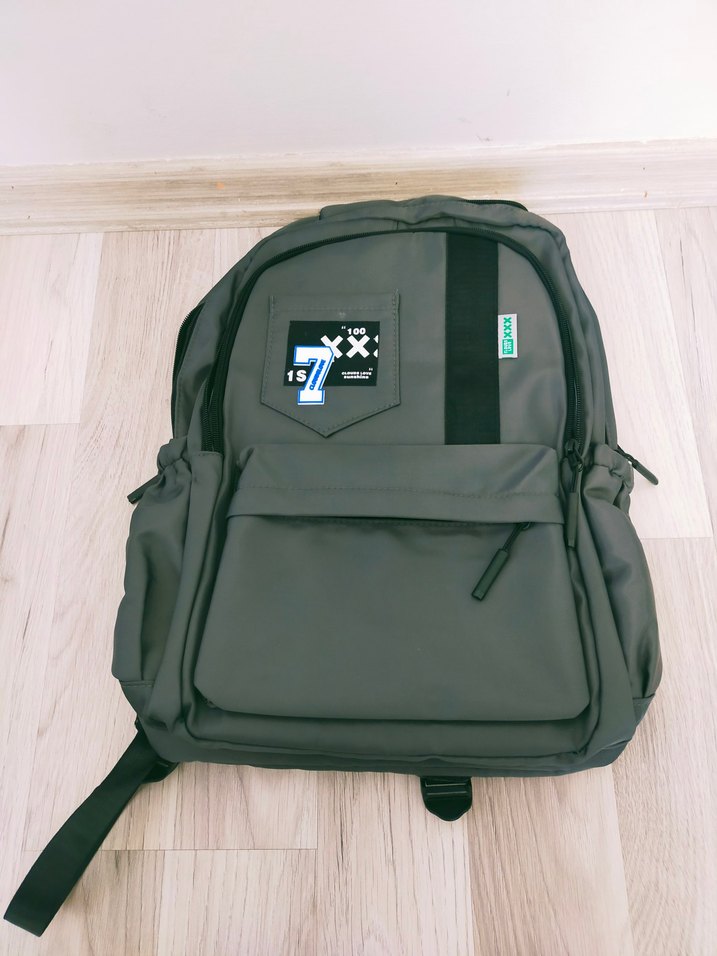 Gri renkli, baskılı ve tokalı kadın sırt çantası. Sentetik kumaştan üretilmiş, sokak stili ve günlük kullanım için uygundur.