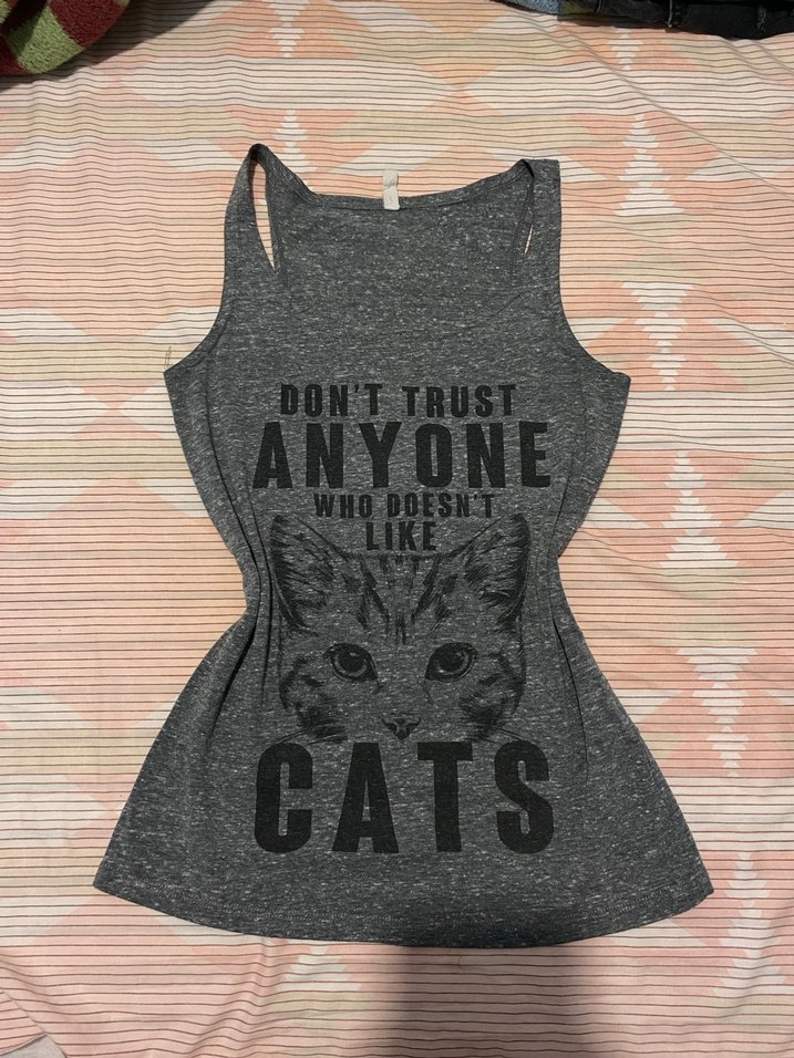 Gri renkli sokak stili atlet, kedi yüzü ve "Kedileri sevmeyenlere güvenme" yazısıyla baskılıdır, zahmetsiz şıklık sunar.