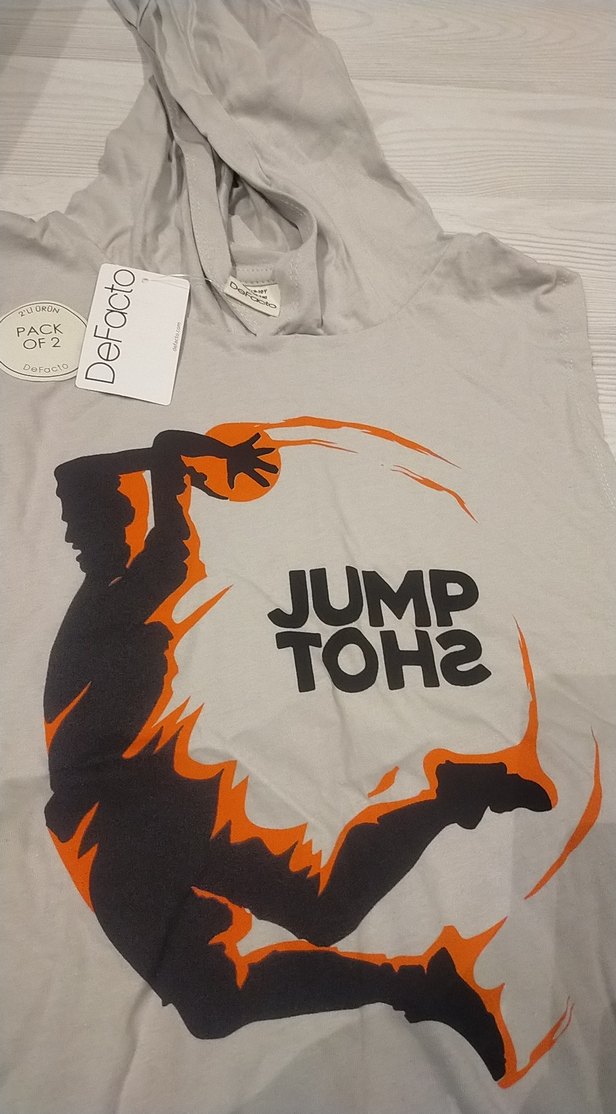 Gri pamuklu, kısa kollu, yuvarlak yakalı bol kesim çocuk tişörtü, canlı baskılı basketbol figürüyle.