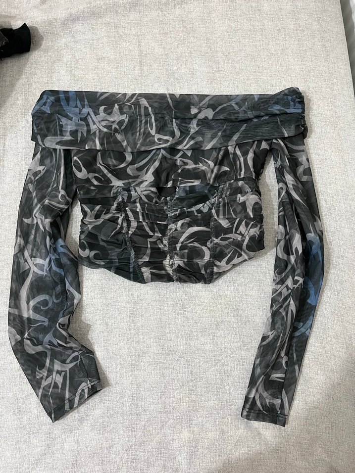 Bu dar kesim kadın bluz, straplez yaka ve drapeli detaylara sahip, uzun kolludur. Gri batik deseniyle avant-garde sokak stili sunar, açık hava etkinlikleri için uygundur.