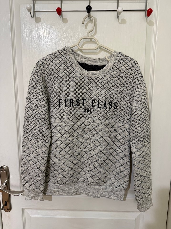 bol kesim, uzun kollu ve yuvarlak yakalı bir sweatshirt. Yumuşak ve sıcak kumaştan, gri renkte, baskılı desenli ve örgü dokulu. Önünde "FIRST CLASS" yazısı bulunur. Trendy günlük tarz için uygun.