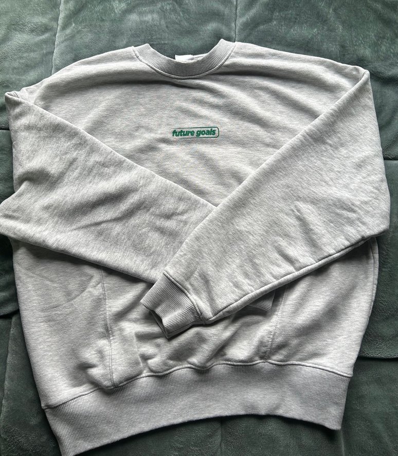 sweatshirt, yuvarlak yaka ve uzun kollu, bol kesimdir. Yumuşak kumaştan gri renkte, 'future goals' baskılıdır. Günlük kullanım için uygundur.