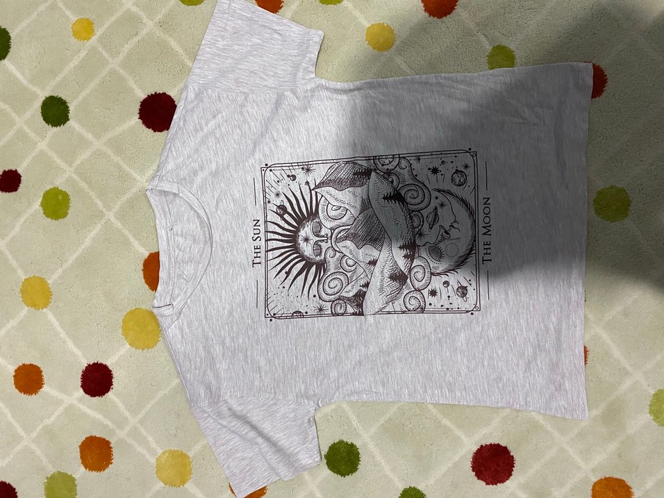 Gri pamuklu tişört, baskılı güneş ve ay deseniyle, yuvarlak yaka ve kısa kollu. Rahat kesim, bohem tarzda günlük kullanım için uygun.