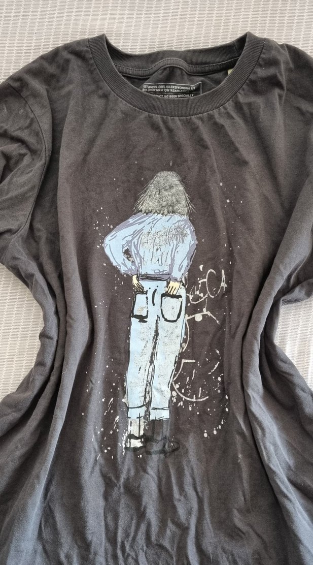 Gri Baskılı Tişört, Bol Kesim, Kısa Kollu