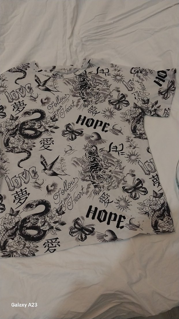 Kısa kollu, gri tişört "HOPE" dahil baskılı desenlerle. Sokak stili ve grunge punk havası taşıyor.