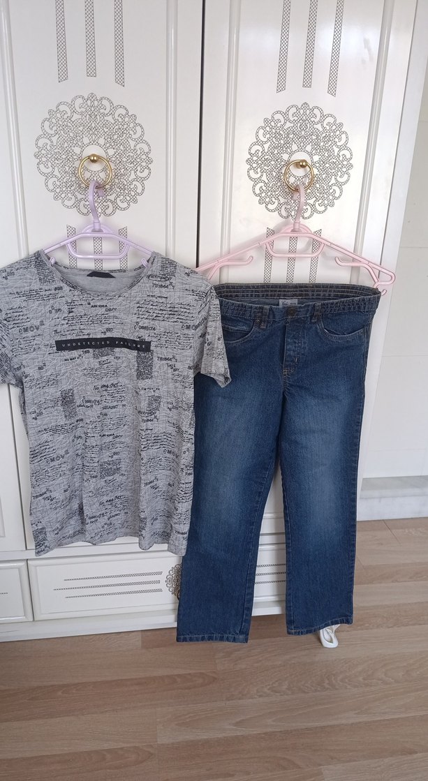 Gri baskılı kısa kollu tişört ile bol kesim kot pantolon içeren takım, gündelik kullanım için rahat ve şık bir görünüm sunar. sadece etiketi yok sıfır
