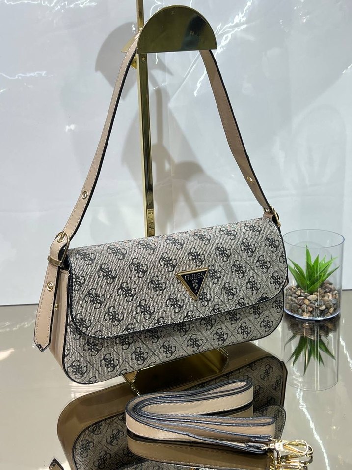 Sentetik kumaştan yapılmış, baskılı desenli ve tokalı gri omuz çantası. Ayarlanabilir askıya sahip, günlük kullanıma uygun.