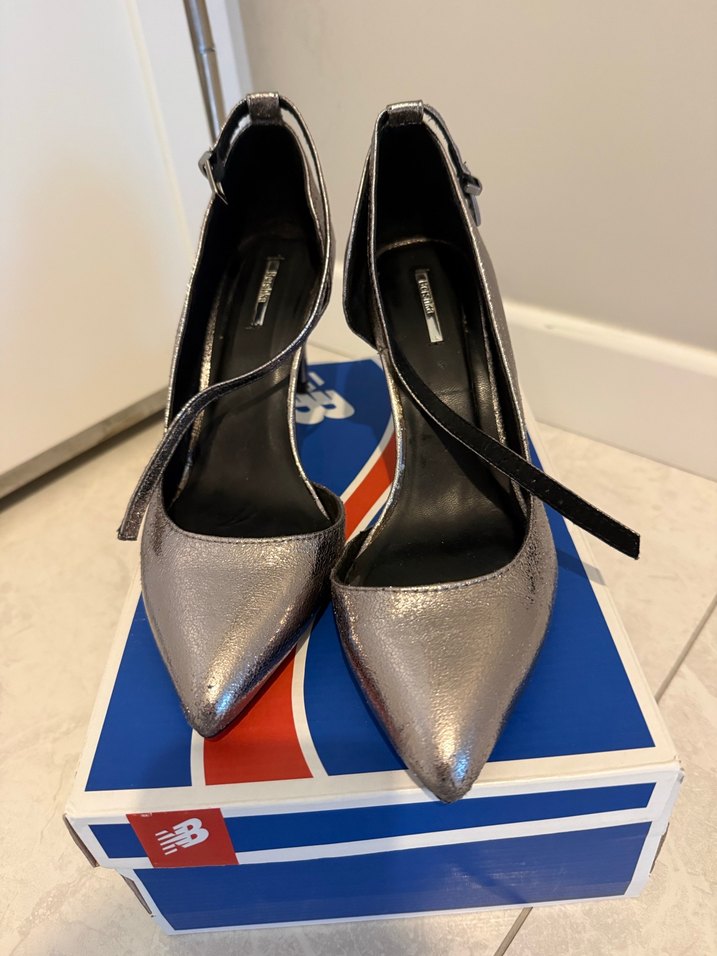 Gri baskılı stiletto topuklu ayakkabılar, tokalı kayışlı ve çağdaş tarza sahip, romantik akşamlar için uygun. Kauçuk malzemeden yapılmıştır.