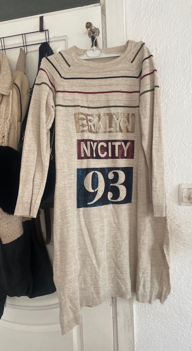 Gri renkli, baskılı ve triko hamile elbisesi. Uzun kollu, yuvarlak yakalı ve bol kesimdir. Pamuklu kumaştan olup günlük kullanıma uygundur.