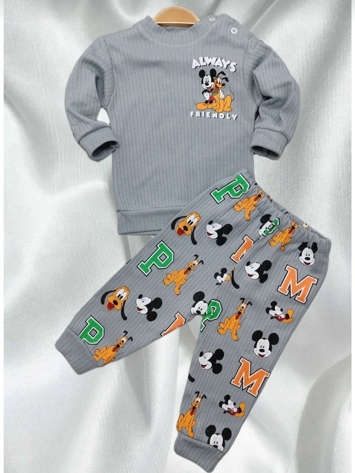 1 Yaş 1,5 Yaş beden seçenekleri mevcuttur Gri renkli, baskılı karakterli, uzun kollu, bisiklet yaka, örgü dokulu üst ve baskılı pantolondan oluşan yumuşak ve rahat bebek takımı.