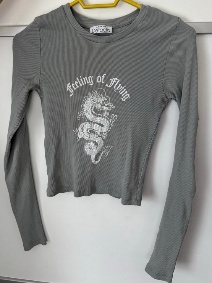 Gri renkli, baskılı ejderha ve 'Feeling of Flying' yazılı, uzun kollu dar bel boyunda body hic giymedim