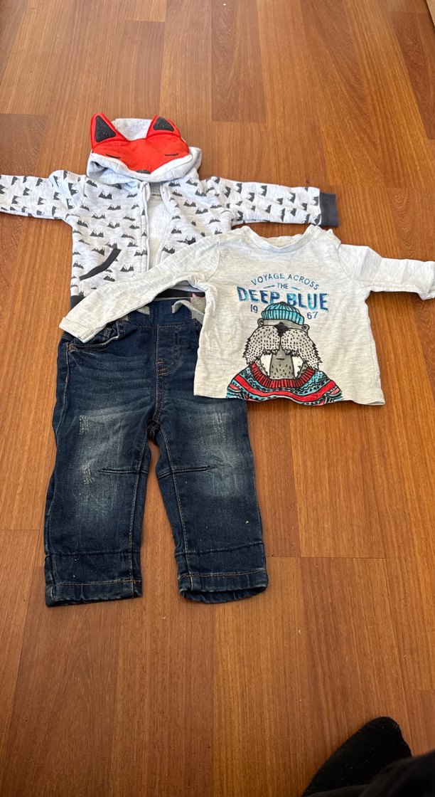 Gri baskılı uzun kollu, bisiklet yaka üst ile 'DEEP BLUE' yazılı, örme denim pantolon ve tilki kapüşonlu ceket içeren erkek bebek takımı.
