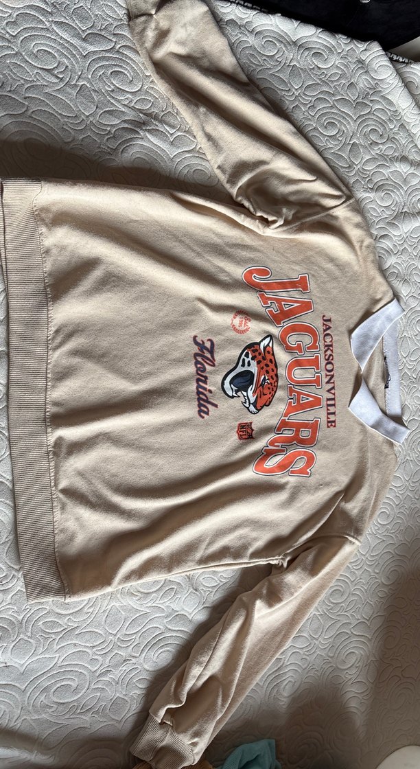 Gri renkli, uzun kollu ve bisiklet yaka kadın sweatshirt. Baskılı Jacksonville Jaguars deseni ve fermuar detayına sahip, sentetik kumaştan üretilmiştir.