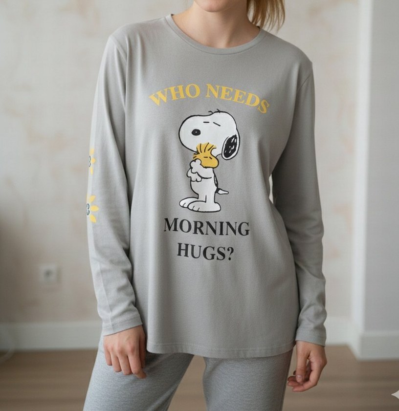Gri renkli, uzun kollu, bol kesim ve bisiklet yaka kadın sweatshirtü. Yumuşak ve sıcak kumaştan, kabarık detaylı. Üzerinde 'WHO NEEDS MORNING HUGS?' yazılı baskı bulunur. ☁️