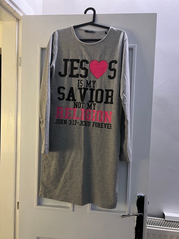 Pamuklu, bol kesim, uzun kollu, bisiklet yaka ve kuşaklı tuniktir. Önünde dini mesaj baskısı bulunur. Mütevazı sokak stili için uygundur. ✝️