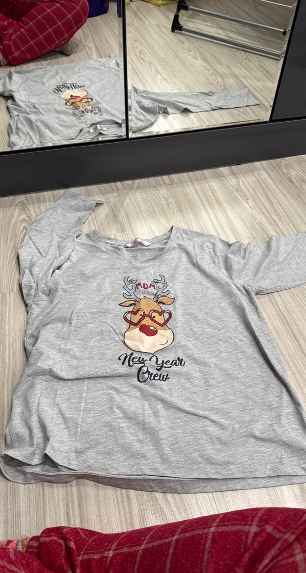 Gri renkli, uzun kollu ve bisiklet yaka hamile gömleği, yumuşak örme kumaştan üretilmiştir. Baskılı geyik ve 'New Year Crew' yazısı bulunur. Rahat ve günlük kullanıma uygundur.