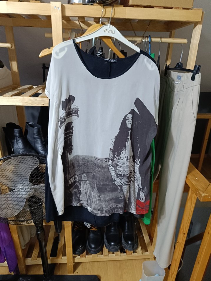 Gri Baskılı Uzun Kollu Salaş Tişört
