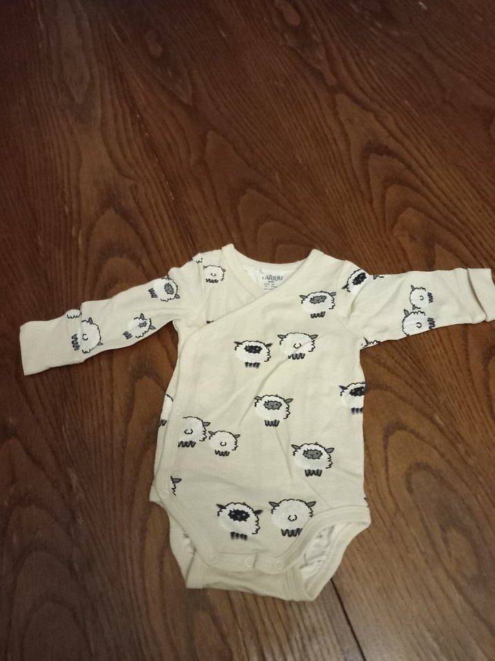 Yumuşak yünden yapılmış, gri koyun desenli beyaz uzun kollu V yakalı bebek body, düğmeli kapama ile kolay kullanım sağlar.