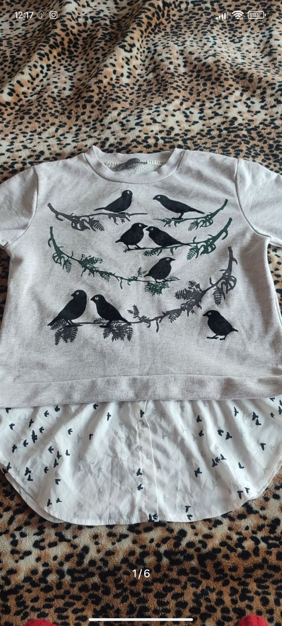 Gri pamuk rahat kesim ve yarım kollu. Yuvarlak yaka, örme dokulu ve kuş desenli, günlük kullanıma uygun.