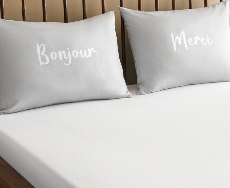 Gri renkli 'bonjour' yazılı baskılı yastık kılıflarıyla. Yumuşak ve rahat kumaş. 50X70 Cm boyunda