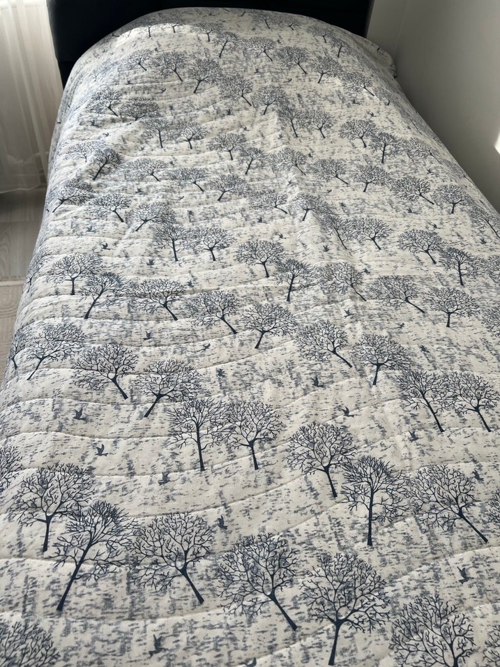 Gri renkte, ince ağaç desenleriyle baskılı yatak örtüsü, yatak odasına sakin ve doğal bir hava katıyor.