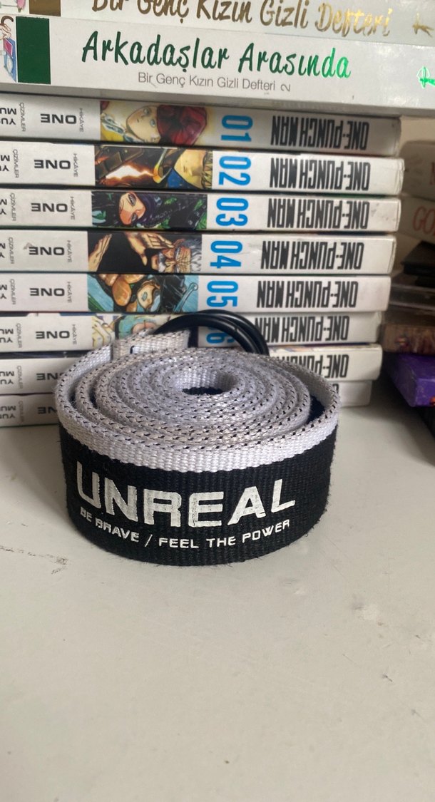 Gri renkte, "UNREAL" baskılı yoga kayışıdır. Esnek ve dayanıklıdır, yoga sırasında esneme ve destek sağlar. ♀️