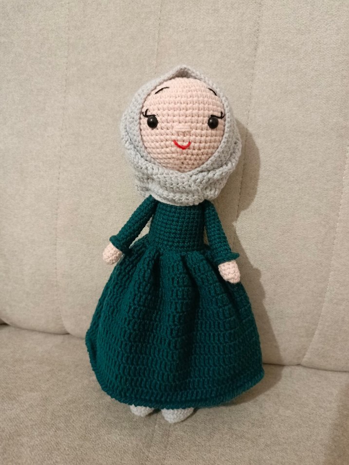 Gri başörtüsü ve koyu yeşil elbise ile el örgüsü bebek, yüzü detaylı nakışlı.