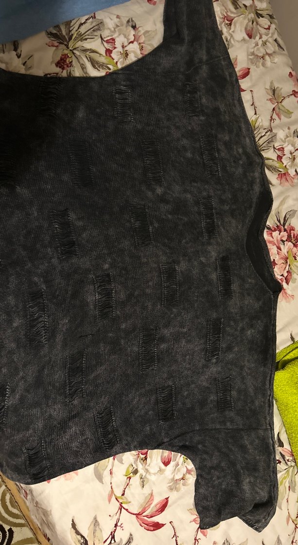 Gri batik desenli, bol kesim kadın kazak. Uzun kollu ve tekne yaka, bohem tarzı için uygun.