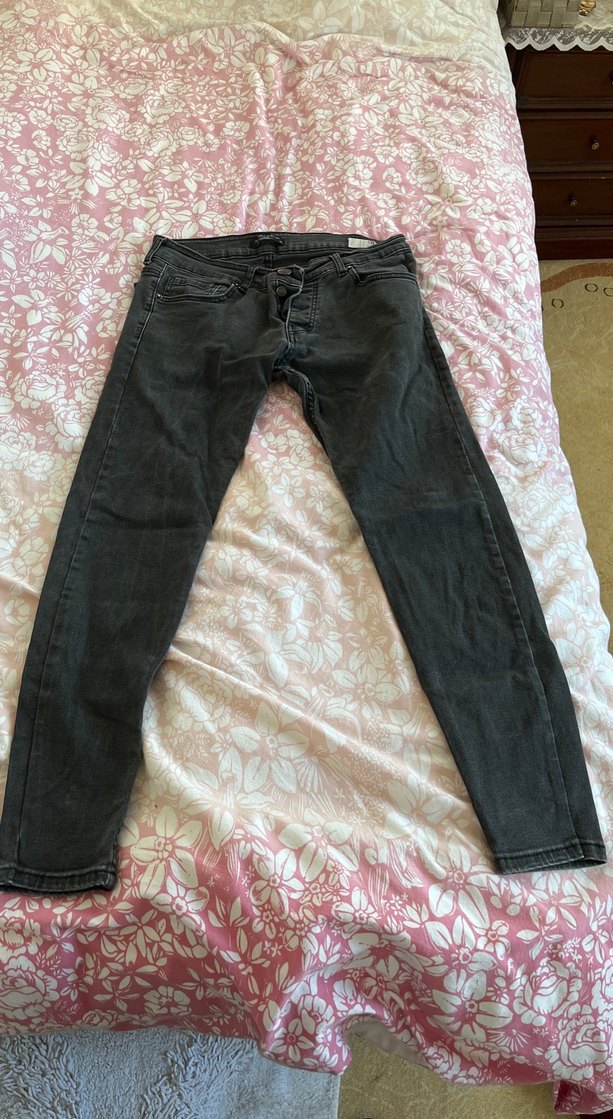Gri batik desenli, düğmeli, bol kesim erkek kot pantolon. Normal boy, günlük kullanım için uygun, streetwear tarzına uygun.
