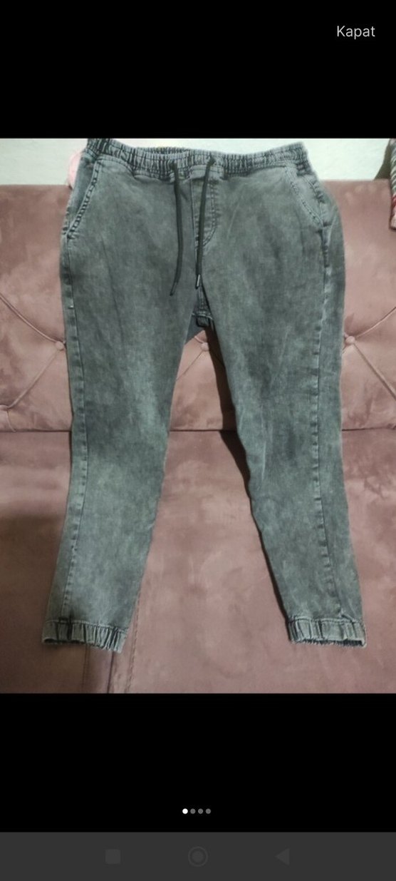 Gri batik desenli kot pantolon, bol kesim ve kemer detayına sahip, günlük rahat kullanım için uygundur. Midi boy ve rahat bir tarza sahiptir.