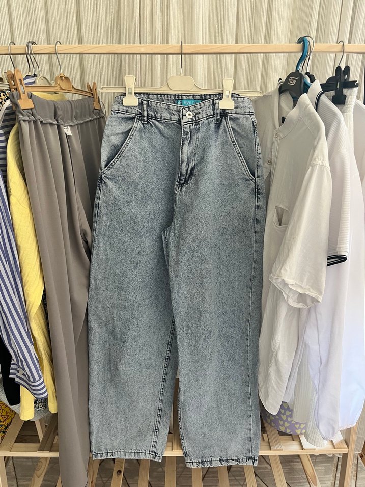 Gri batik desenli, bol kesim ve normal boyda denim jean. Rahat ve şık, günlük kullanıma uygun.