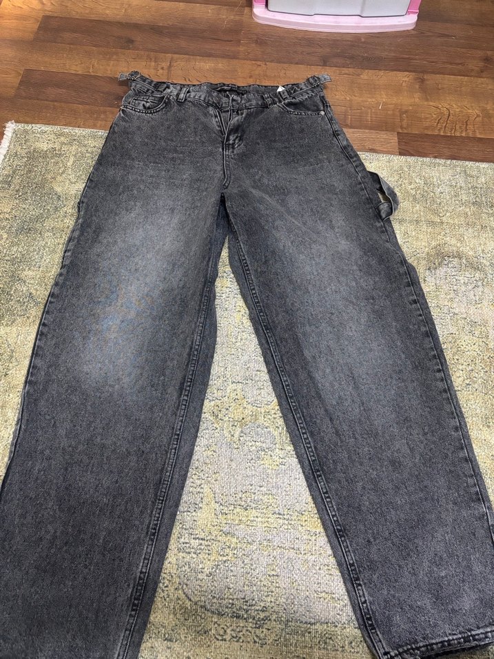 Gri batik desenli, bol kesim ve kemerli kadın jean. Midi boyu ve rahat kesimiyle günlük sokak modasına uygun.