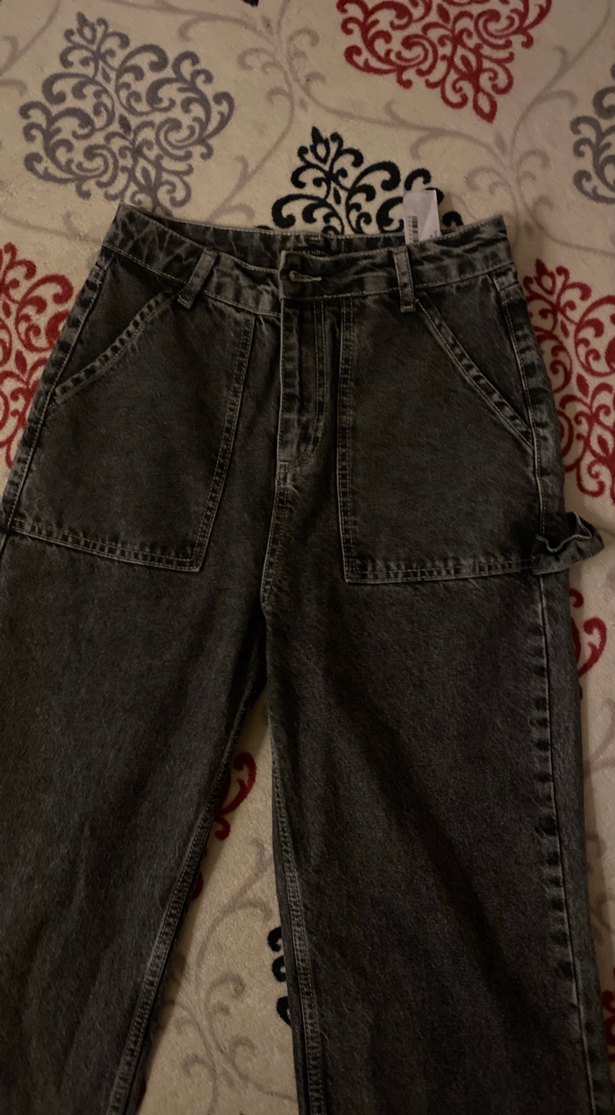 Gri batik desenli, bol kesim kadın kot pantolon. Düğmeli ve normal midi boyda, rahat sokak stili için uygundur.