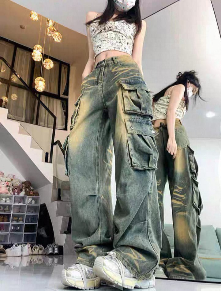 Bol kesim, gri kot pantolon; batik desenli ve kemerli. Midi boy, cepli, sokak stili ve grunge punk esintili. Günlük rahat kullanım için uygun.