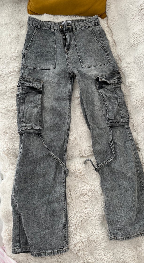 Gri batik desenli, bol kesim kemerli kadın kot pantolon. Kargo cepli ve midi boyda, günlük sokak stili için uygun.
