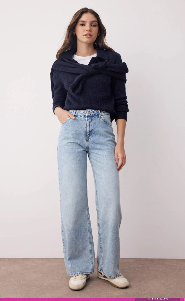 Gri batik desenli, bol kesim mavi denim pantolon, normal boyda, günlük kullanım için zahmetsiz şıklık sunar .