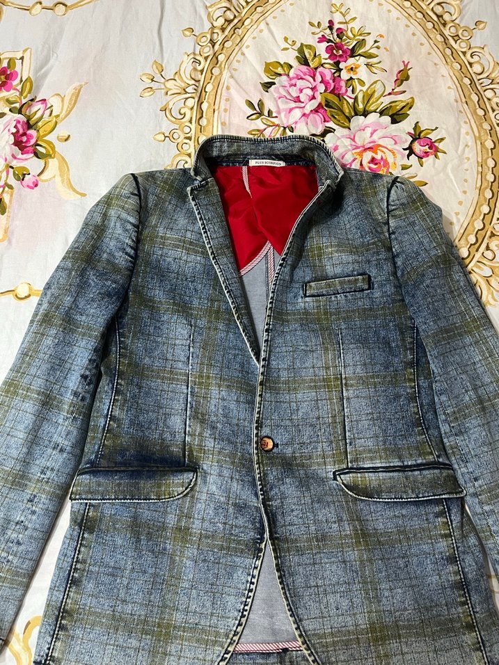 Gri batik desenli denim erkek ceketi, kruvaze yakalı ve düğmeli. Normal kesim ve uzun kollu, günlük kullanım için uygundur.