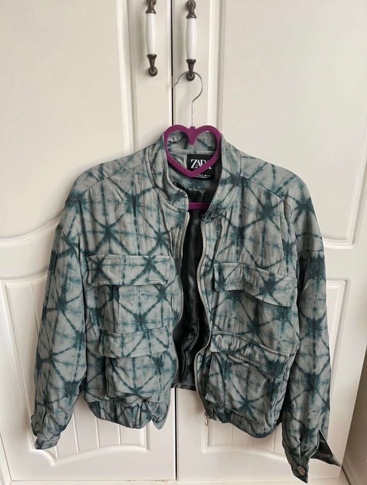 Gri batik desenli, fermuarlı, bol kesim denim kadın ceket. Uzun kollu, kesik yaka tasarımlı, günlük sokak stili için uygun.