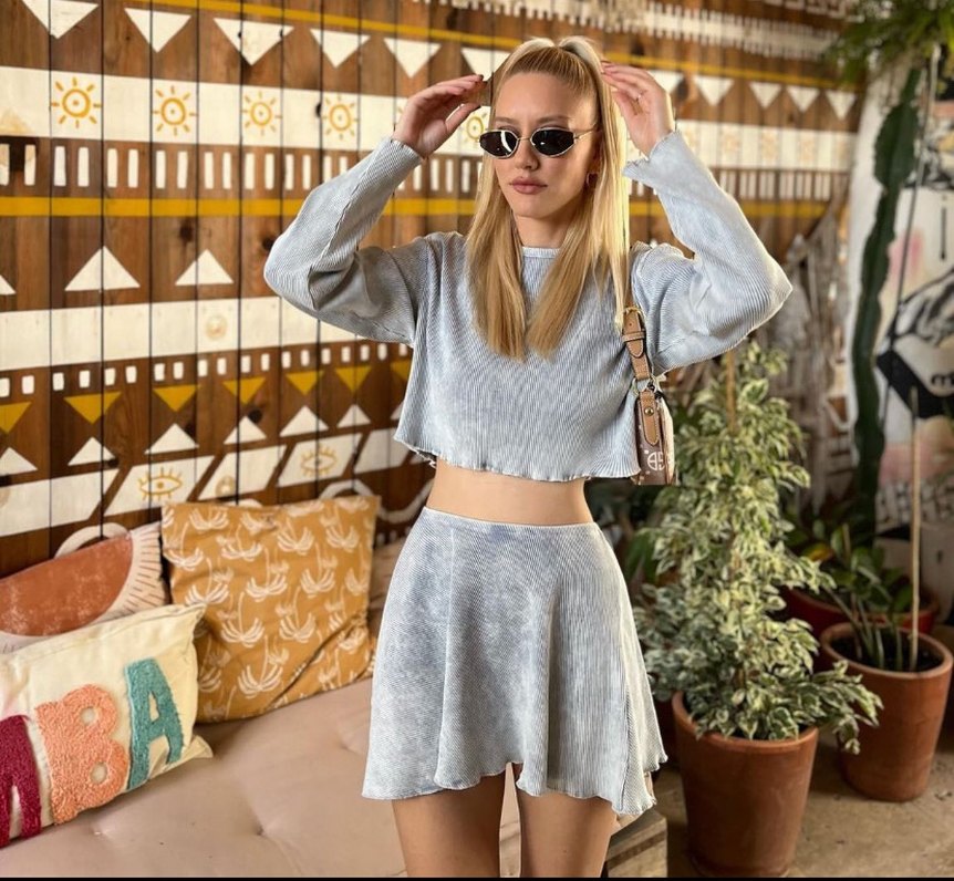 Gri batik desenli, bol kesim denim mini etek, günlük kullanıma uygun rahat ve şık bir stil sunar. Trendy, sokak stiline uygundur.