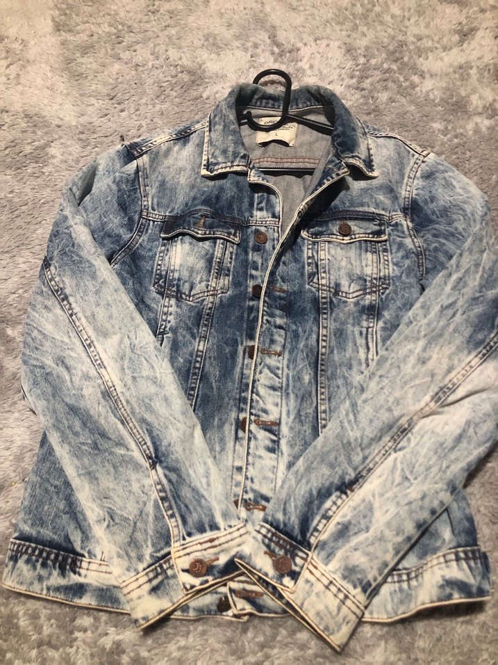 Gri tonlarda batik desenli, düğmeli, bol kesim, uzun kollu ve yakalı erkek kot ceketi. Rahat ve gündelik bir tarz sunar.