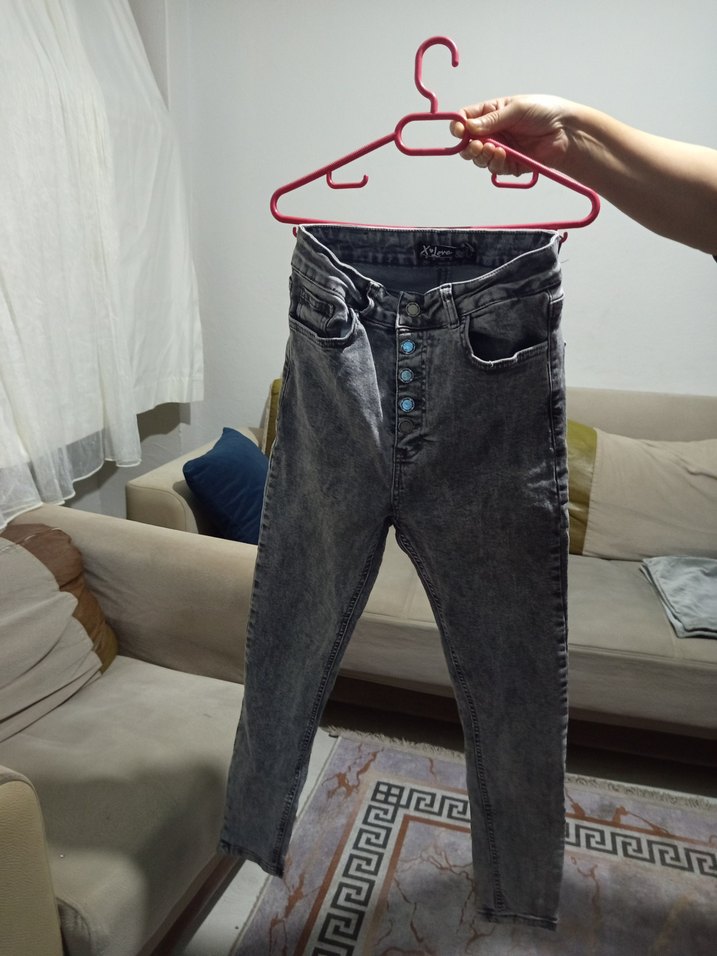 Düğmeli ön kapama ve batik desenli gri renk, dar kesim kadın jean. Günlük kullanıma uygun, trend sokak stili