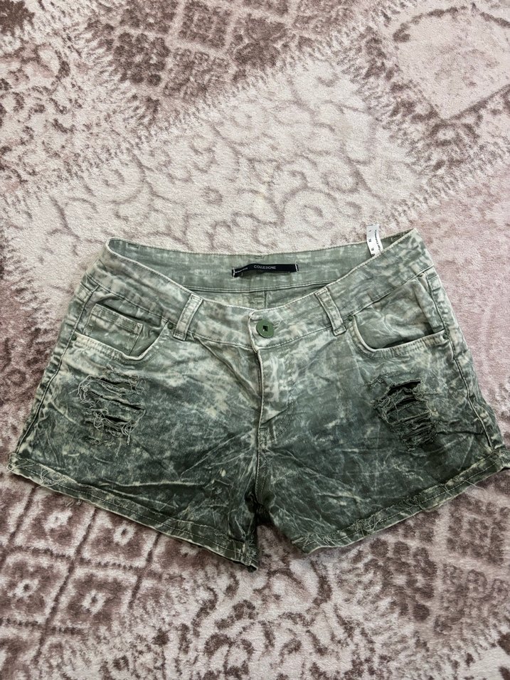 Gri renkte, bol kesim ve düğmeli kapamalı, batik desenli ve yıpratma detaylı kadın kot şort, dış mekan kullanımı için uygundur.