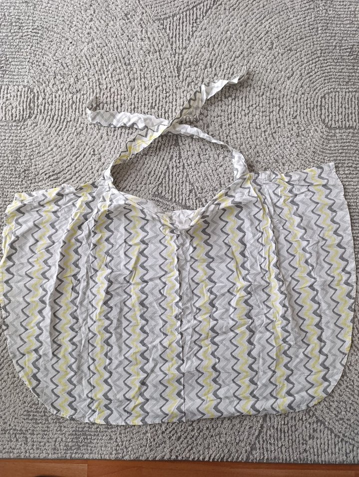 Gri batik desenli zigzaglı emzirme önlüğü, ayarlanabilir boyun bağı ile yumuşak kumaştan yapılmıştır.