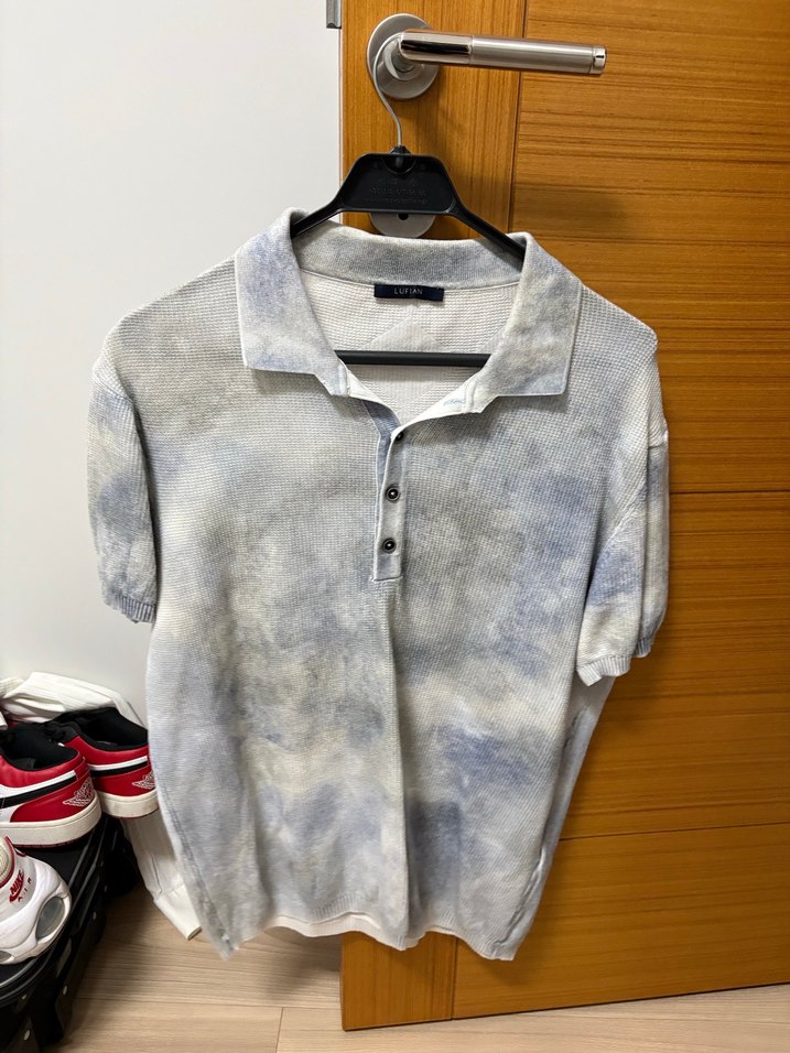 Gri batik desenli, keten kumaştan erkek polo tişört. Kısa kollu, düğmeli yakalı ve bol kesimdir. Normal boyda, günlük kullanıma uygundur.