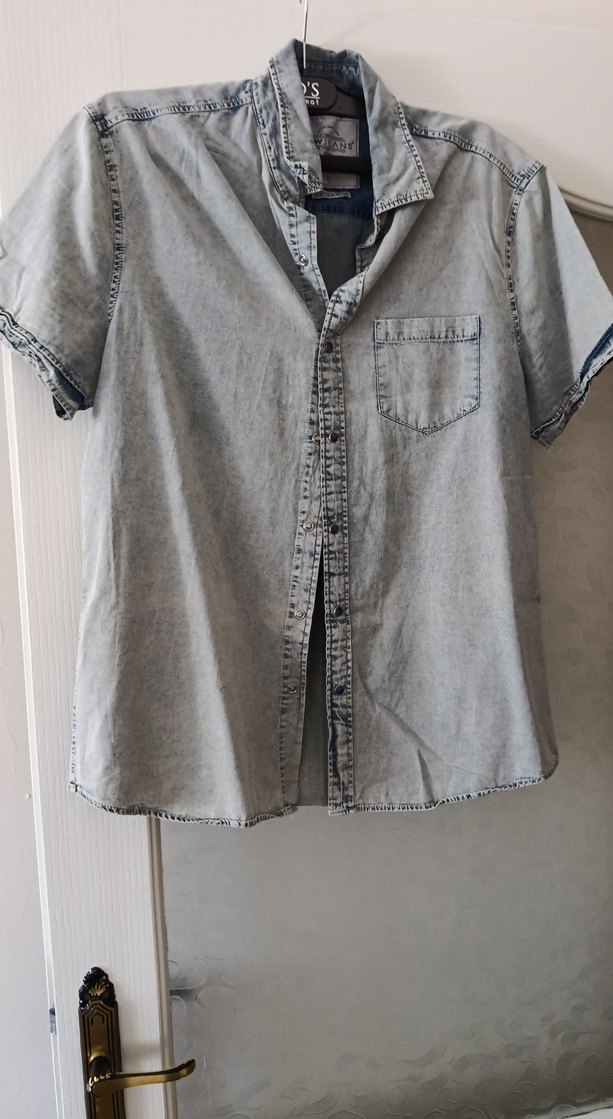 Gri batik desenli denim gömlek, kısa kollu ve düğmeli. Salaş kesimi ve yakalı tasarımıyla gündelik sokak stiline uygun. L beden